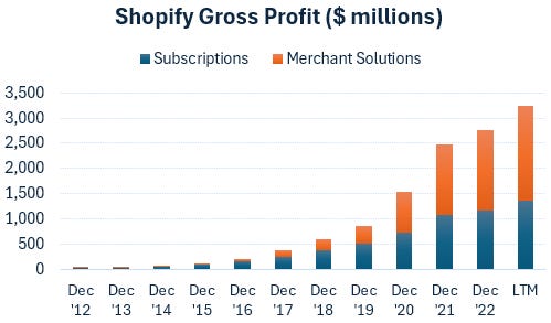 Shopify divides its revenues into two businesses, software subscriptions and merchant solutions (where payments processing is a large contributor). As the merchant solutions business is lower margin compared to software subscriptions, on a gross profit basis both segments’ contribution is more balanced (chart below). Although clearly the merchant solutions are delivering the highest growth: