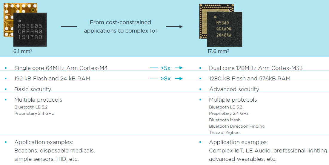 Two examples of Nordic SoCs are shown below, the smaller one is aimed at BLE while the other offers a wider variety of protocols: