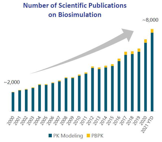 The number of scientific publications making use of biosimulation has been accelerating over the covid years: