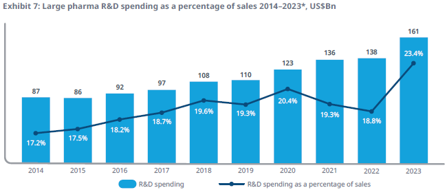 The chart below illustrates how large pharma R&D has been growing at a 7% rate. However, biotech is much more volatile, with booms and busts of R&D funding. According to Simulations Plus (SLP), the overall spend on drug development from large pharma and biotech combined would be around $200 billion per annum. Within that, biosimulation is a market of only $3 billion and is growing at an attractive annual rate of around 17%.
