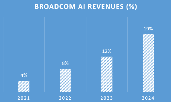 As also Broadcom is the strong player in both networking and other datacenter technologies such as connectivity — together with Marvell again — these AI datacenter revenue streams would start contributing 19% to Broadcom’s revenues this year: