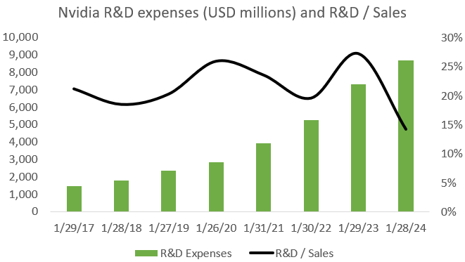 A lot of financial analysts have the impression that AI coding is happening in CUDA, which would give Nvidia a strong moat on the software side, but this is unfortunately not the case. Practically all AI code is written in Pytorch, which can run on top of CUDA, CPUs, and now also increasingly on AMD’s ROCm GPU computing platform. If you want to run a Pytorch model on another GPU, you have to use a compiler provided by the manufacturer or alternatively, write your own. Both Pytorch and Hugging Face, i.e. the community to share AI models, are very motivated to extend support for ROCm and other GPU computing platforms as they don’t want the future of AI to be controlled by a single manufacturer. So why is everyone then still buying Nvidia GPUs if we can now run our Pytorch model over AMD GPUs as well? Well, we’ll go into this later, but Nvidia’s GPUs are simply still way better at running workloads. Additionally, as LLMs have to be deployed over multiple GPUs, Nvidia has both the networking hardware and software libraries to easily do this both in training and inferencing. So CUDA won’t be a sufficient moat in the long term to stay ahead of competition. In my view, what Nvidia really needs is a fast pace of innovation in the AI ecosystem, both on the software and the hardware sides. The company is now spending $8 billion annually in R&D to advance the Nvidia ecosystem both on the hardware and software sides, and there will be very few players in the world who will have both this budget as well as the required know-how and expertise to even have a chance of competing with this.