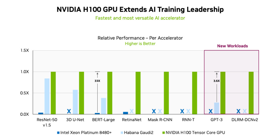 A recent example of the MLPerf test illustrates this, Nvidia’s H100 trumped Intel’s Gaudi on all workloads, and in some quite spectacularly so:
