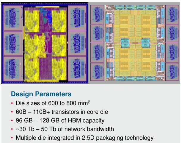 Below are two examples of AI accelerators designed by Broadcom for the internet giants. Obviously these are very advanced chips, large die sizes with up to 110 billion transistors in one die, 2.5D interconnected with 128 GB of HBM and 6 TB of networking bandwidth. Basically it’s a module that’s comparable to Nvidia’s current flagship H100 GPU.
