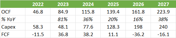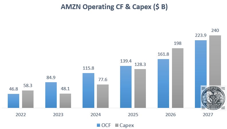 So, the market is worried by a heavy investment cycle in Amazon for the foreseeable future, but we see the risk as limited due to the limited cash burn. If growth comes in less stronger than expected, capex can be dialed down again to unlock strong free cash flow. Vice versa, if growth continues to come in stronger than expected, rising capex can be financed with the growth in operating cash flow. So, negative FCF should already come down again in ‘27 on JP Morgan’s estimates:
