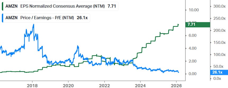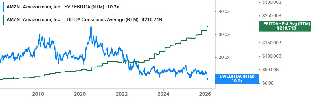 Similarly, also on a PE basis, Amazon is now at its cheapest valuation ever despite, in our view, a compelling growth profile: