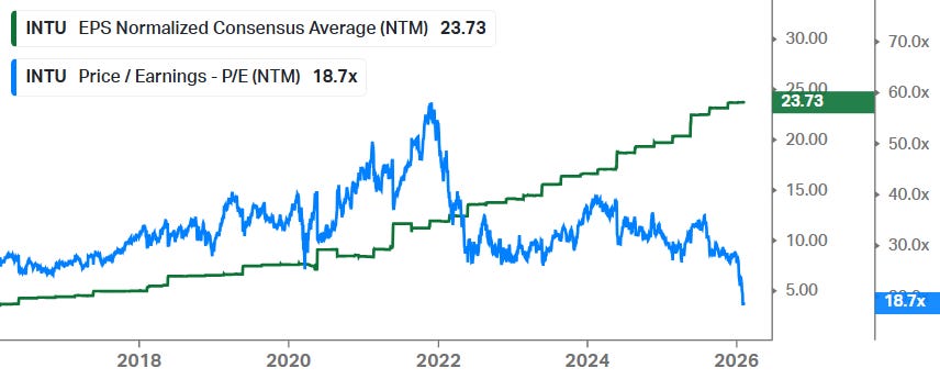 We think that the amount of SMBs that are going to turn off their core accounting software is going to be rather limited. Are you really going to invest time in a difficult accounting software transition, or are you simply going to deploy AI in your existing accounting software to automate your workflows? We suspect that 90+% will do the latter, which means substantial upside for the accounting software names. So, we think that the best-in-class accounting software names are heavily oversold here. Intuit’s EPS are still trending up—and these will very likely continue to trend up, we think it will actually accelerate—and at some point in the coming years the market will start figuring out that this is actually a great business and then we’ll see a rerating: