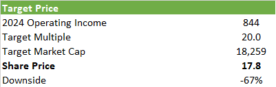 Putting the 2024 operating income on a 20x multiple, I arrive at a market cap of around $18 billion and a share price of $18, giving 67% downside from the estimated opening share price of around $54.