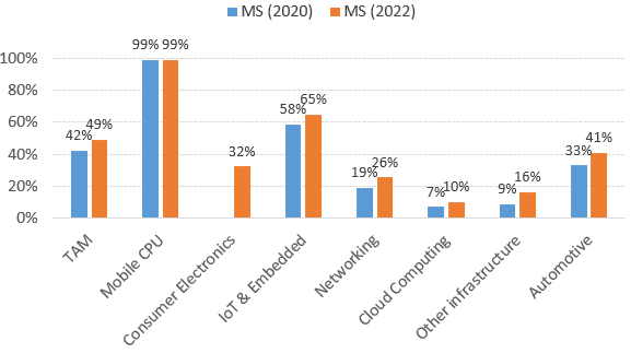 The company ARM has a lot of attractions, it has a strong market share in providing instruction set architecture (ISA) designs for CPUs and microcontrollers, giving shareholders access to recurring revenue streams stemming from royalties. The company is especially dominant in this field in mobile CPUs, but also has strong positions in internet-of-things (IoT), consumer electronics, and automotive. And they have been growing share in networking and the high-growth cloud computing market. ARM cites the below market shares in their prospectus: