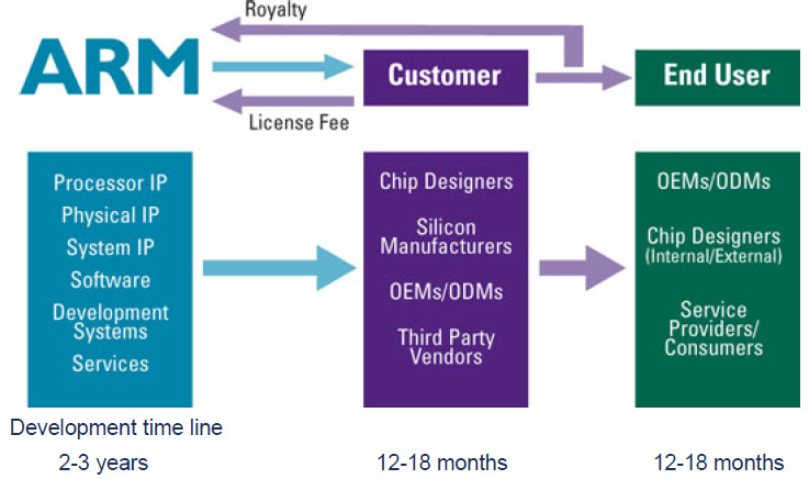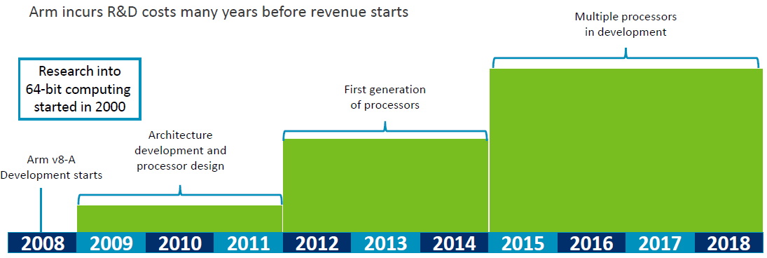 While the development of the ARM v-8 core was started in 2008, as from 2012 ever more processors were developed based on this design. Thus, ARM does significant and lengthy R&D upfront which other semi designers leverage from over the subsequent decade.