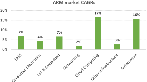 ARM cites the below end-market CAGRs in their prospectus. Cloud computing and automotive are clearly the most attractive markets, with also IoT expected to grow at a high single-digit rate.