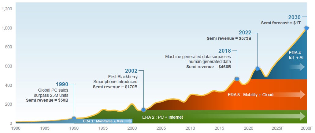 The illustration below highlights well how as computing power is continuously becoming more widespread around the globe, demand for semiconductors keeps moving upward. From Applied Materials: