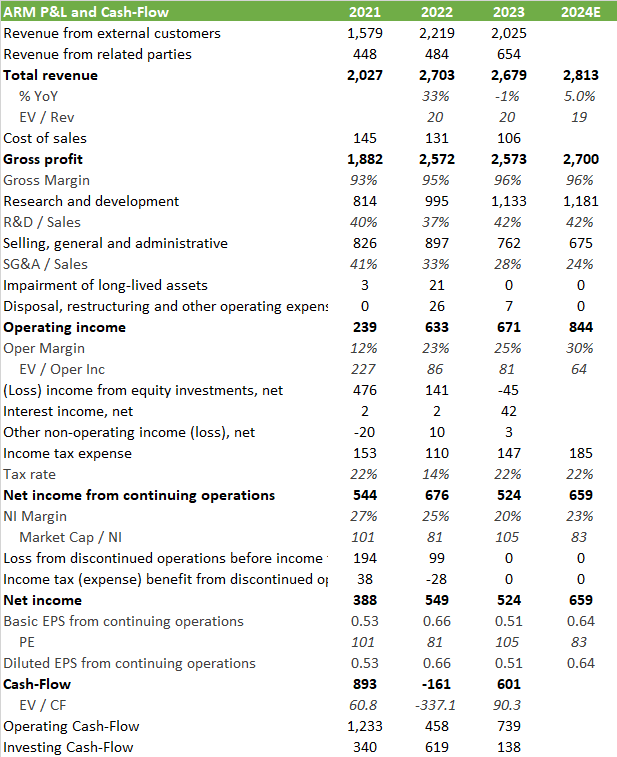 Softbank acquired ARM to step up its investments, which can be difficult for a public company, and drive growth in new areas such as IoT. However, my reading of their financials is that they succeeded in the former, but not so much in the latter. ARM managed to grow revenues at a 7% CAGR over the 2017-2023 period, whereas over the 2010-2017 period, they were growing at a 15% CAGR, mainly driven by the smartphone revolution: