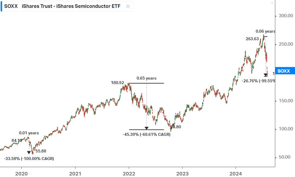 The bear case would be that if the economic data worsens considerably, the market could go into a longer-style bear market, with rallies here and there in between. However, this panic looks to me likely to be temporary pullback. First of all, the Fed has a lot of ammunition with the fed funds rate currently being at 5.33%. And naturally there is also the option of QE later on if interest rates cuts don’t turn the tide. I’d be a lot more concerned if we still had high inflation and the Fed would have to keep rates high, this is basically what happened in the early eighties when stock market valuations went to an all time low.