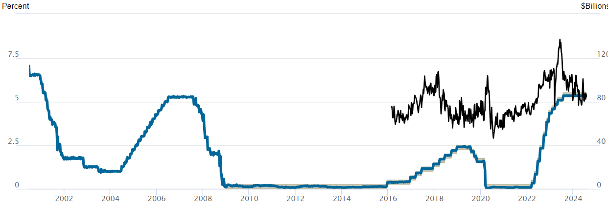 And the Fed has plenty of room to do so given where the Fed funds rate (blue line) is: