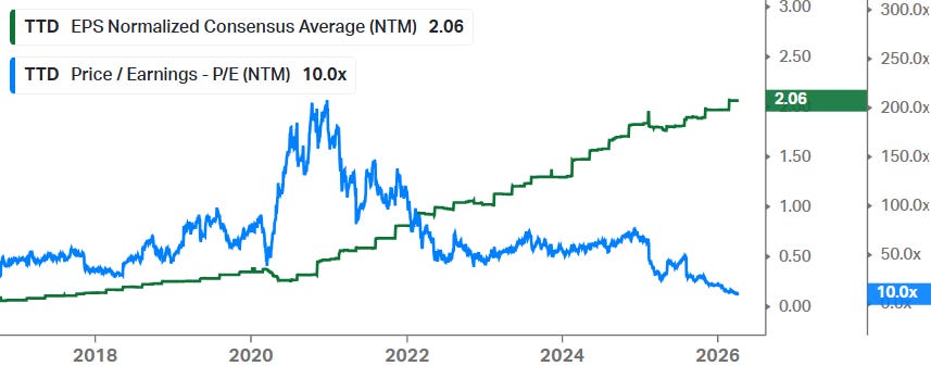 Over the past 1.5 years, TTD shares sold off heavily due to a variety of factors. We can see that EPS performance actually still has been positive, with negative share price momentum being driven by multiple compression. The shares are now trading on a 10x forward PE:
