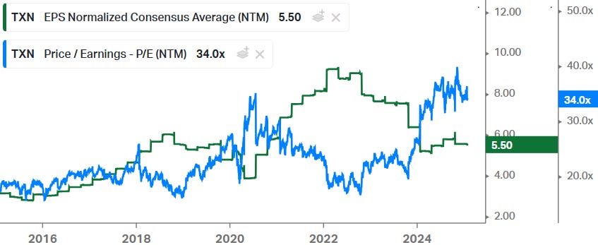 A recent example of that typical scenario is Texas Instruments. As the company’s earnings went into a downturn, the stock’s PE multiple expanded:
