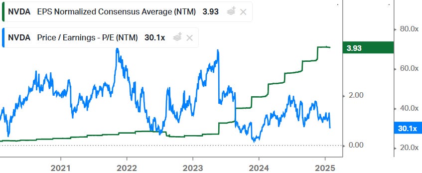 However, looking at Nvidia’s valuation, the current forward PE of 30x is already pricing in an earnings correction. The way this works is that cyclical names tend to trade on bottom multiples when the market reckons that earnings are on a cyclical high. So when earnings subsequently go through a cyclical correction, you start to see multiple expansion as the market starts factoring in the next upcycle.