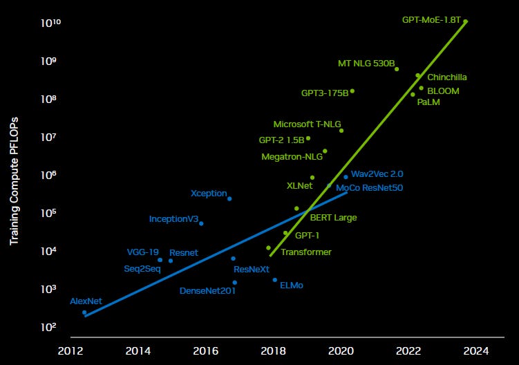 Most of these increases in compute demand have been driven by scaling laws, i.e. the observation that larger AI models trained on larger amounts of data and for larger amounts of time tend to perform better. Scaling laws are still alive and well as several of the leading players in LLMs are talking about 1 and 2 million GPU training clusters. And these will be Blackwell clusters. For comparison, OpenAI’s ChatGPT 4 was trained as 25,000 A100s.