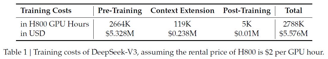 The results are huge gains in efficiency and according to DeepSeek, one could train their model in less than 2.8 million H800 hours. The H800 is the Nvidia Hopper GPU which China used to be allowed to import. Assuming a cost to rent one of these GPUs at $2 per hour, this leads to estimated overall training cost of around $5.6 million: