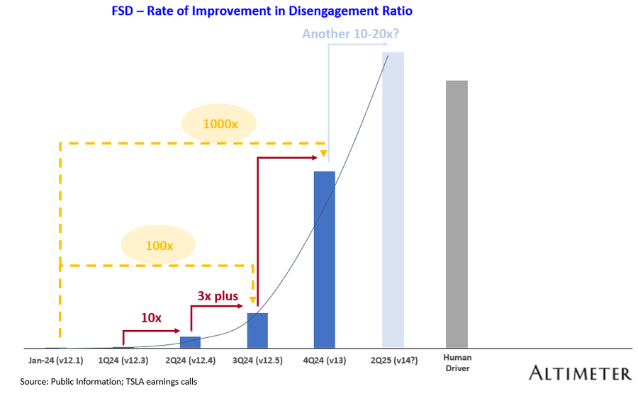 “For the miles between critical interventions, we already made a 100x improvement with FSD 12.5 from the start of this year and then with the v13 release, we expect to be 1,000x from January of this year. This came in because of technology improvements, going end-to-end, having a higher frame rate and partly also helped by Hardware 4's better capabilities. We hope that we can continue to scale the neural network, the data, the training compute et cetera.” — Ashok, Tesla’s VP of Autopilot