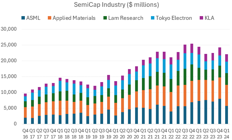 After the covid semi boom of 2020-2022, the semicap industry went into a typical cyclical correction. However, semicap shares have been rallying strongly over the last half year in anticipation of a new round of strong orders coming in the near future. The drivers for these are: gate-all-around in logic, HBM and DRAM in memory, each regional geopolitical power building up its own domestic semiconductor manufacturing capacity, and naturally all of these being further boosted by structural AI demand.