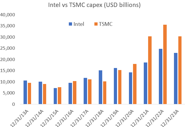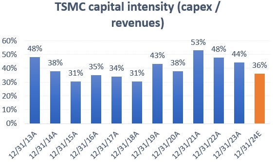 Later this decade, as the semi industry grows to $1 trillion in size and more, semicap is expected to become a $150 to $200 billion industry, assuming a capital intensity of 15 to 20%. Capital intensities are much higher in leading edge semis though, with leading foundry TSMC spending continuously 30 to 50 percent of revenues on capex: